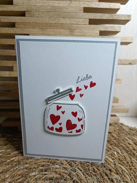 Da ist sie - die Karte mit ganz viel Liebe. Diese war die meist ausgewählte Variante zum Nachbasteln auf der Messe am Sonntag. Mal wurde noch zum Geburtstag hinzugestempelt oder auch ein Glücksklee - alles möglich mit diesem vielseitigen Set, das immer "geht" SÜSSES BONBONGLAS. Ich hatte auch ein kleines Messeangebot, denn wer dieses Set mit dem Set WEIHNACHTSFREUDE IM GLAS (verlinke ich auch gleich mal mit) bestellt, bekommt von mir als zusätzliches Geschenk zu den 10 % Shoppingvorteilen