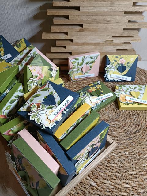 Bestimmt wird sich jemand über diese Verpackung freuen und auch die Ergebnisse meiner Teilnehmer werden sich sehen lassen können! Die liebe Rella hatte sogar noch eine Idee, die mir noch gar nicht in den Sinn gekommen ist. Nämlich den "Deckel" in die "Box" stecken! So braucht man auch fast keine Banderole mehr, um das ganze zu halten. Tolle Idee, die entstehen, wenn Gleichgesinnte sich zusammen treffen und sich austauschen! Das macht Stampin'Up aus...