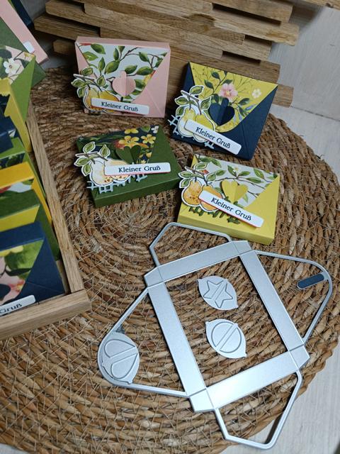 Diese/s Karte/Album ist wieder einmal ein Projekt vom Zoom. Nicht nur, dass Du damit ein Geldgeschenk oder eine Gutscheinkarte verschenken kannst, auch das Einfügen vom Bildern ist möglich. Sie bietet eine Menge Platz und ich habe auch noch gar kein Grundweiß für den persönlichen Gruß eingeklebt, aber das kann ja jeder machen, wie er möchte. Der kleine Umschlag ist übrigens mit den Stanzformen KREATIVE KRÄUTER gemacht. Die muss ich gleich noch mal verlinken, habe ich ganz vergessen in der Stampin'Up Übersicht. Denn wenn Du dem jeweiligen Link in meinen Beiträgen folgst, bekommst Du die Produkte zu sehen und könntest sie Dir auch gleich in den Warenkorb oder in Deine Wunschliste legen. Oder mir schicken, dann würde ich sie Dir natürlich auch in den nächsten Sammelbestellung mitbestellen.
