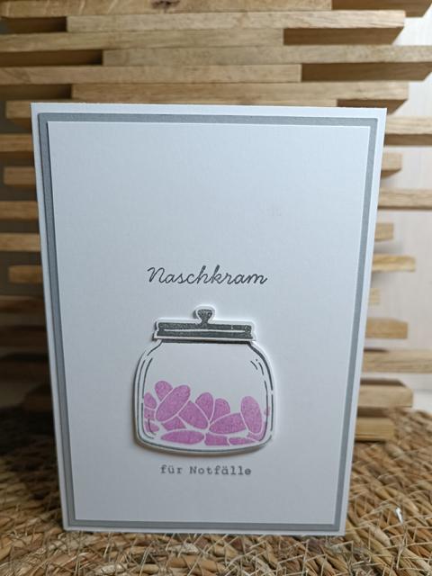 zum Nachbasteln dieser vier Varianten. Die Geburtstagskarte gefällt mir am Besten. Den Bastlern am Sonntag die mit den Glutroten Herzchen. Tatsächlich sind diese Karte schnell gemacht. Du konntest sogar die Gläser "vorstempeln" und immer nach Bedarf "füllen". Die Grundkarte ist in Grundweiß extrastark (besser als Kartenbasis als der einfache Karton Grundweiß), dann einen Aufleger in Schiefergrau und dann wiederum einen in Grundweiß der einfachen Art. Das Glas und der Deckel wurden dann mit Dimensionals aufgeklebt, Gruß und fertig. Übrigens ist mir bei der Vorbereitung der Karten aufgefallen, dass die Gläser und die Deckel in den beiden Sets unterschiedlich sind. Beim Glas ein paar Striche mehr und der Deckel gefüllt oder blanko (auch zum Ausmalen in farbiger Form - auch nicht schlecht!) Und nun ich wieder: Das Glas aus dem Set WEIHNACHTSFREUDE IM GLAS und der Deckel aus SÜSSES BONBONGLAS gefallen mir am Besten - gut, dass ich gleich beide Sets gekauft habe.