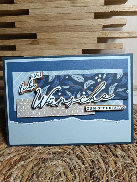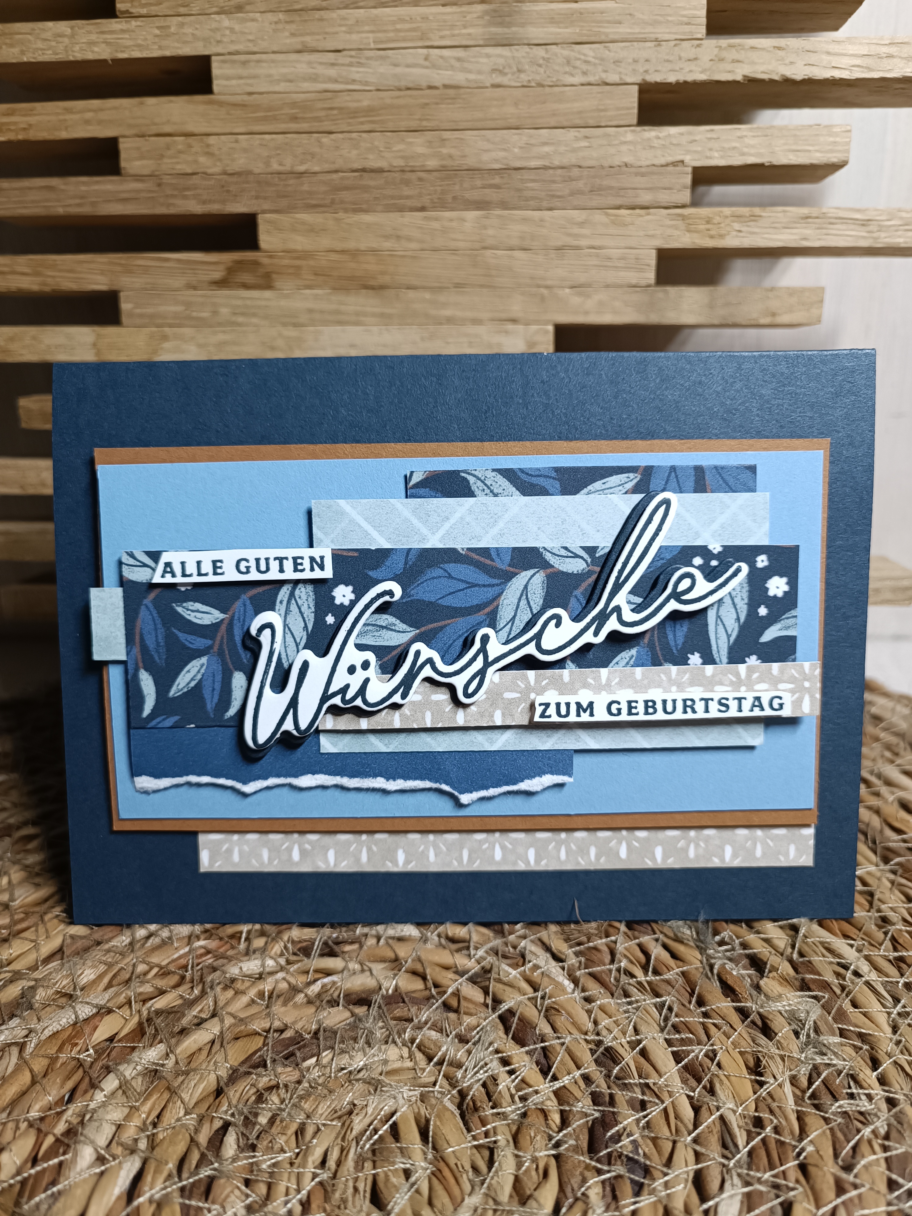... zum Geburtstag mit den schönen Schriftzügen. VIELE WÜNSCHE habe ich schon einmal zur Konfirmation gezeigt. Hier habe ich Streifen vom DSP FRIEDVOLLER GARTEN aufgebraucht sozusagen Resteverwertung. Die Grundkarte ist in Marineblau mit Babyblau und Pekanuss. Wenn auch die Wünsche zweimal ausgestanzt und einmal gestempelt sind habe ich bei den schmalen Grüßen zur Schere gegriffen. Und zu guter Letzt habe ich noch ein Farbduo in Abendblau genommen und gerissen. So kann man den weißen Kern sehen und ich finde, die Karten können sich sehen lassen? Was meinst Du?